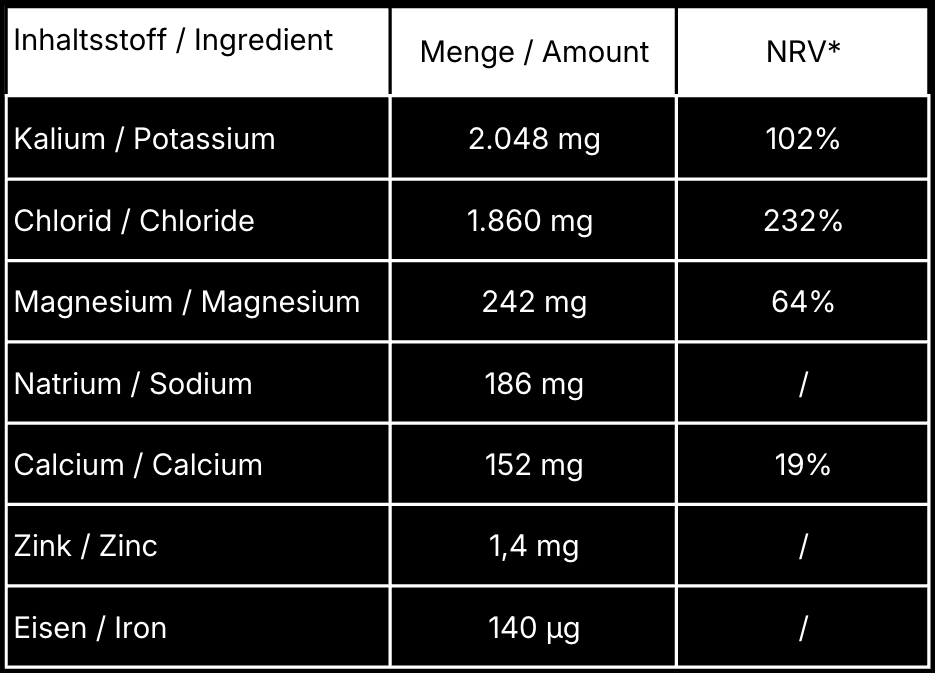 Kaliumchlorid, Magnesiumtricitrat, Maltodextrin, Säuerungsmittel: (Citronensäure, Äpfelsäure), keltisches Meersalz, Calciumcarbonat, natürliches Zitronenaroma, natürliches Aroma, Süßungsmittel: Sucralose, Farbstoff: Rote Bete, Zinkgluconat.