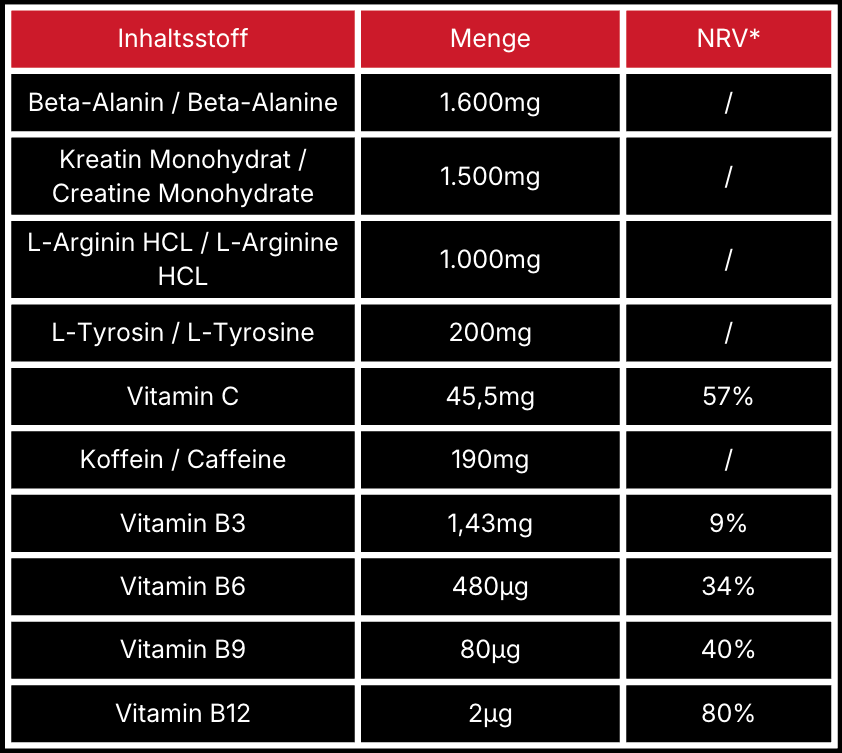 Maltodextrin, Beta-Alanin, Kreatin Monohydrat, L-Arginin HCL, Koffein, L-Tyrosin, Zitronensäure, L-Ascorbinsäure (Vitamin C), Aroma, Süßungsmittel: (Acesulfam-K, Sucralose), Riboflavin (Vitamin B2), Nicotinamid (Vitamin B3), Pyridoxal-5-Phosphat (Vitamin B6), Folsäure (Vitamin B9), Methylcobalamin (Vitamin B12)