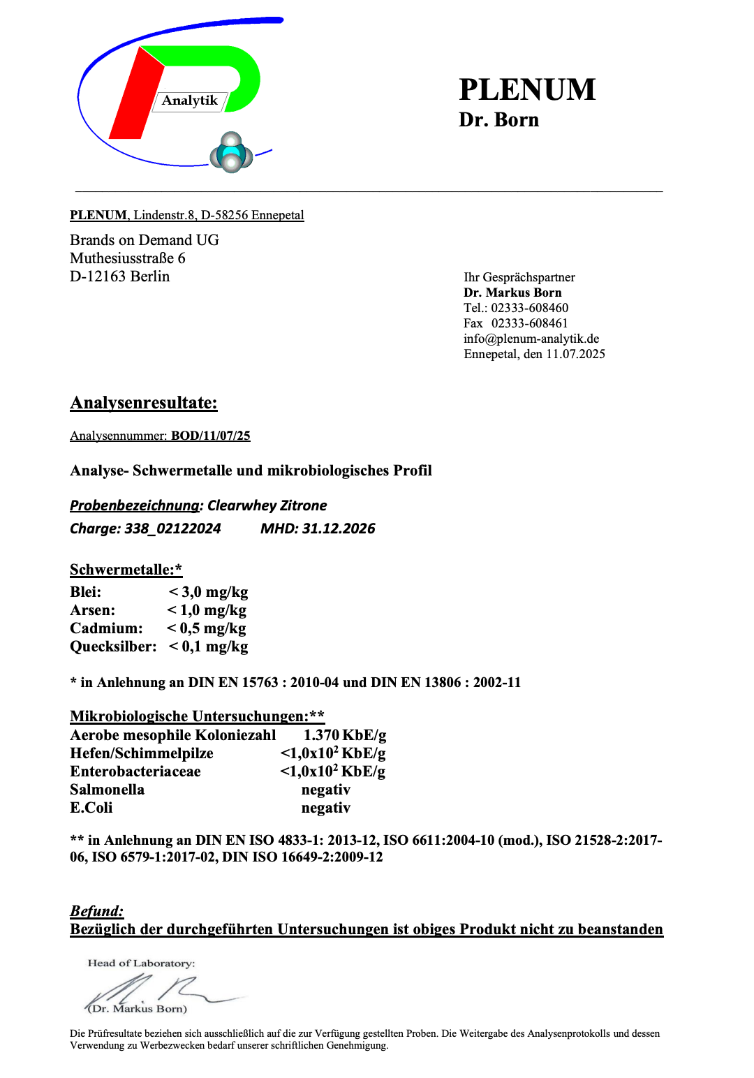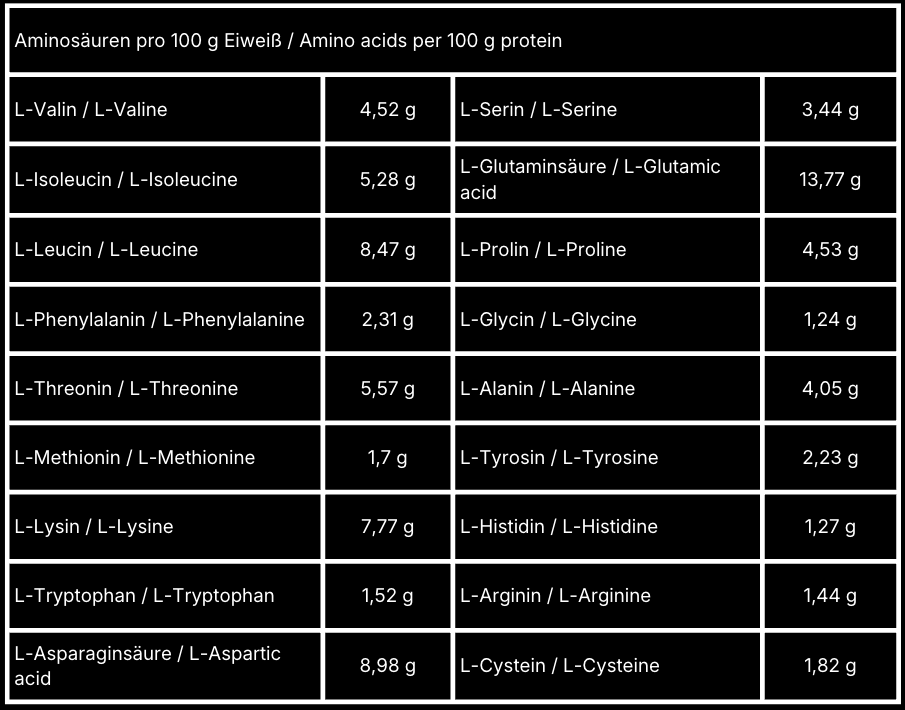 Molkenproteinisolat (96,2%), Aroma, Säuerungsmittel: (Äpfelsäure, Zitronensäure), Süßungsmittel: (Sucralose, Acesulfam-K), Farbstoff: Gerstenmalzextrakt