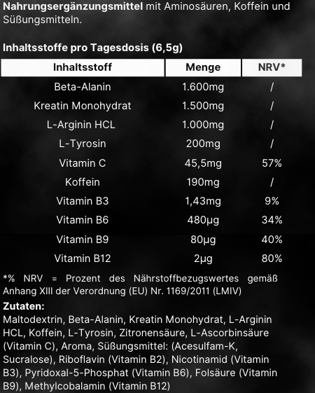 Zutaten: Maltodextrin, Beta-Alanin, Kreatin Monohydrat, L-Arginin HCL, Koffein, L-Tyrosin, Zitronensäure, L-Ascorbinsäure (Vitamin C), Aroma, Süßungsmittel: (Acesulfam-K, Sucralose), Riboflavin (Vitamin B2), Nicotinamid (Vitamin B3), Pyridoxal-5-Phosphat (Vitamin B6), Folsäure (Vitamin B9), Methylcobalamin (Vitamin B12)